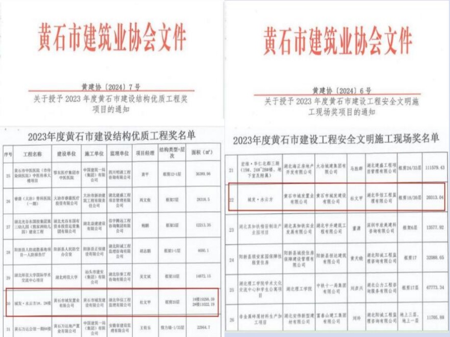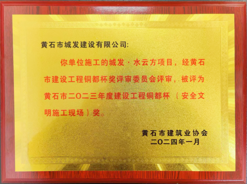近日,由黃石市城發(fā)建設有限公司承建的城發(fā)·水云方項目榮獲黃石市2023年度建設工程安全文明施工現(xiàn)場和結構優(yōu)質工程獎。